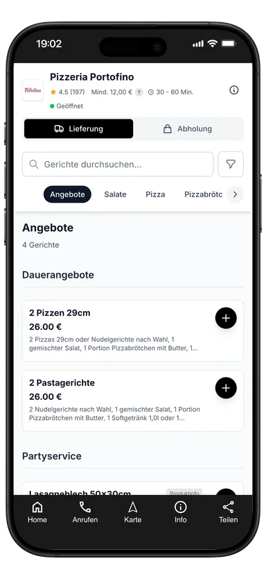 2 Pizzas 29cm oder Nudelgerichte nach Wahl, 1 gemischter Salat, 1 Portion Pizzabrötchen mit Butter, 1 Softgetränk 1,0l oder 1 Lambrusco 0,7l